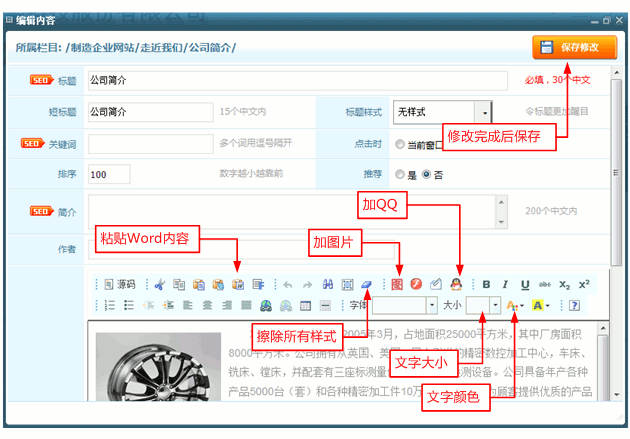【内容】是您的完整公司介绍,该编辑区域是所见即所得的带格式的编辑区,编辑区上部有各种效果的按钮和下拉框,使用方法类似MS word的用法,您可自行研究一下。为了使公司介绍更加形象和富有表现力,可以把自己公司的介绍性图片放进去,插入图片,可以使用编辑区上班的那个小图标,在上面的图片中用红圈【图】标识的。