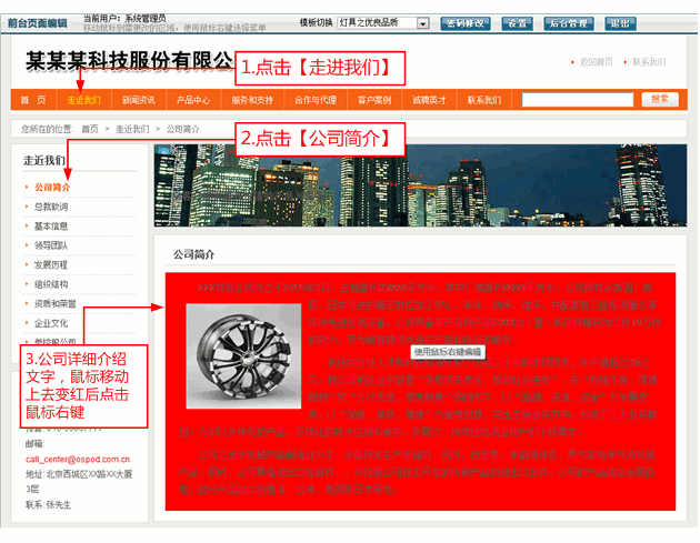 系统缺省的内容一般为【公司简介】。 将鼠标移动到该位置,见到底部颜色变为红色,说明公司简介的编辑状态已经激活。
