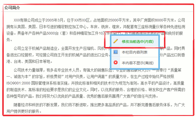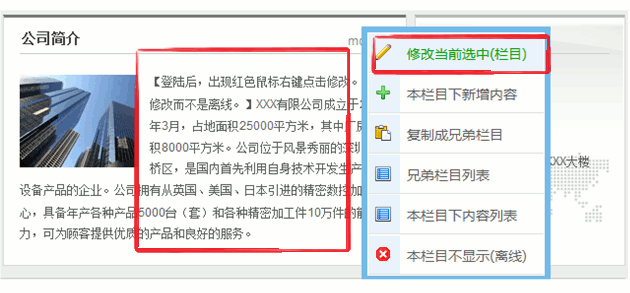 在公司简介的位置上点击鼠标右键,会有弹出菜单如下图,点击【修改当前选中】,会弹出一个页面。