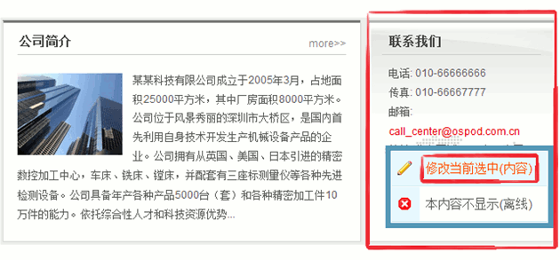 1:鼠标移动到首页【联系我们】区域,点击鼠标右键,选择【修改当前选中(内容)】