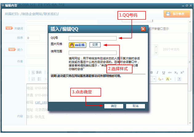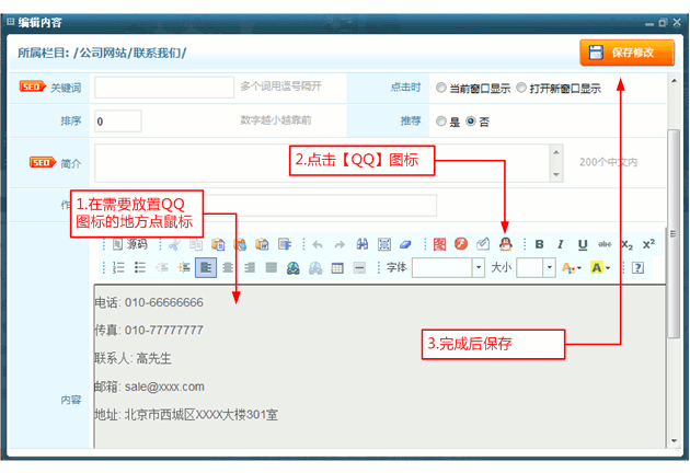 您可以在联系我们或者其他任何内容中添加QQ联系的图片,以方便客户与您联络。下面以首页的联系我们为例进行说明: