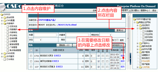 2.点击【cms配置】-【内容管理】,选择需要调整时间的新闻,点【修改】