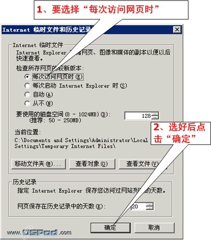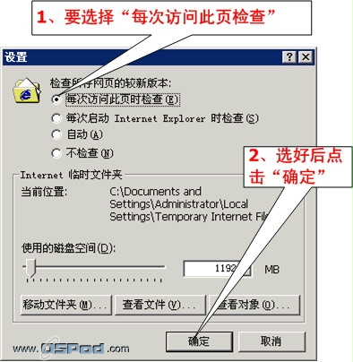 c:设置“检查网页的较新版本”为“每次访问此页检查”,好了后点“确定”按钮。