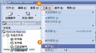 1)首先设置邮件帐号,打开Outlook Express后,单击“工具”菜单,选择“帐户”。