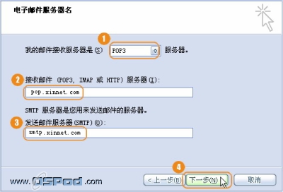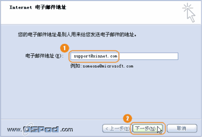 (4)输入邮箱管理员分配给您的邮件地址,如:support@xinnet.com,然后点击“下一步”。