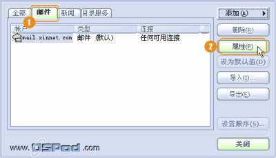 (8)除此之外,还需要设置SMTP服务器身份验证:在“邮件”标签中,双击刚才添加的帐号或者点击右边的“属性(P)”,弹出此帐号的属性框。