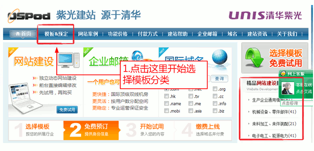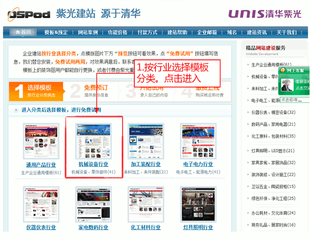 企业建站先按行业选择分类,挑选模板并预定,免费试用两周,录入内容,对效果满意后,联系紫光建站客服交费,解析域名上线。具体流程为: