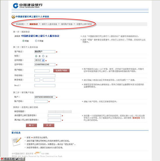 3、阅读协议、填写个人基本资料、填写账户信息、设置网上银行密码
