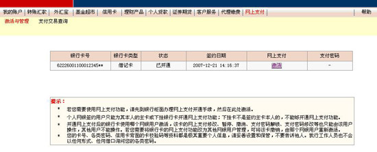 2、在柜面开通后,您需登录个人网上银行对已开通的银行卡进行“激活”操作。激活后,您即可以使用该银行卡进行网上支付了。