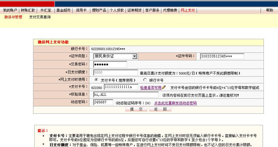 输入证件号码、交易密码等身份验证信息,设定支付卡号、核验信息后,您即可激活该卡的网上支付功能。