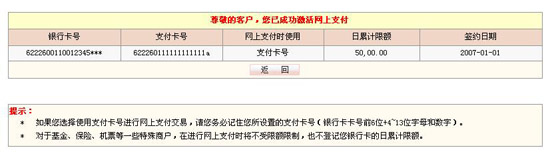 需要注意,您只能为您本人的签约主卡或下挂银行卡开通网上支付功能,银行卡不是您本人的,不能由您为其开通网上支付功能。