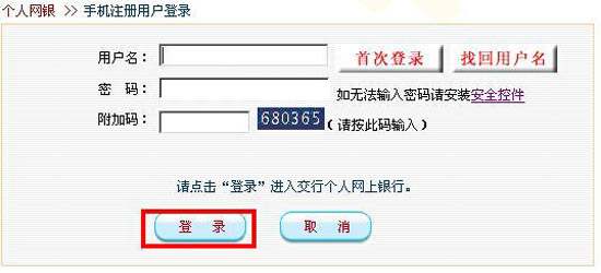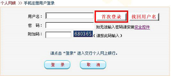 “首次登录”操作完毕,客户每次输入用户名及登录密码即可登录个人网银手机注册版。