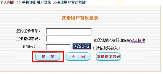 第二步:输入签约卡号、查询密码(在柜台签约时设置)、附加码,点击确定。