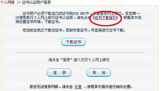 客户首次登录证书认证版时,需先下载数字证书至USBKEY中,登陆https://pbank.95559.com.cn/personbank/index_cert_logon.html,点击《证书下载指引》后,根据提示内容逐步操作即可。